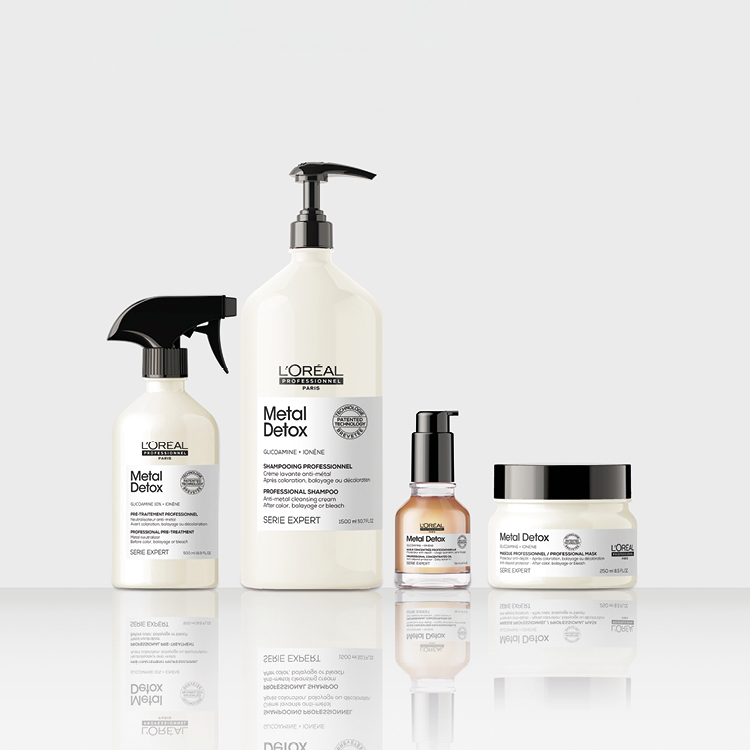 En salon, nous proposons le service complet. À la maison, il est important de continuer à utiliser le shampooing et le masque Metal Detox. Sans sulfate, le shampooing nettoie en douceur la fibre et le masque nourrit intensément les cheveux sans les alourdir grâce à sa texture crème légère.